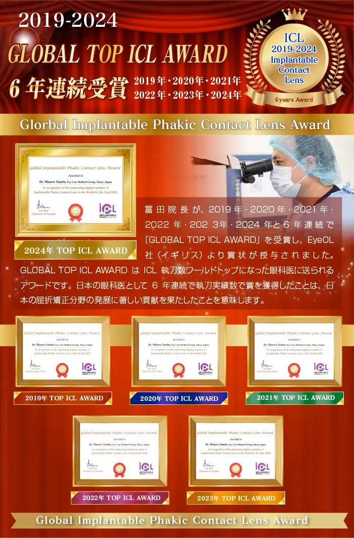 冨田院長は、2019年~2024年まで6年連続で「TOP ICL AWARD」を受賞しています。6年連続でICL手術(後房型レンズ)の症例実績世界No,1を獲得したことは、日本人眼科医として初の快挙です。これも多くの患者様から支持されてきた賜物です。