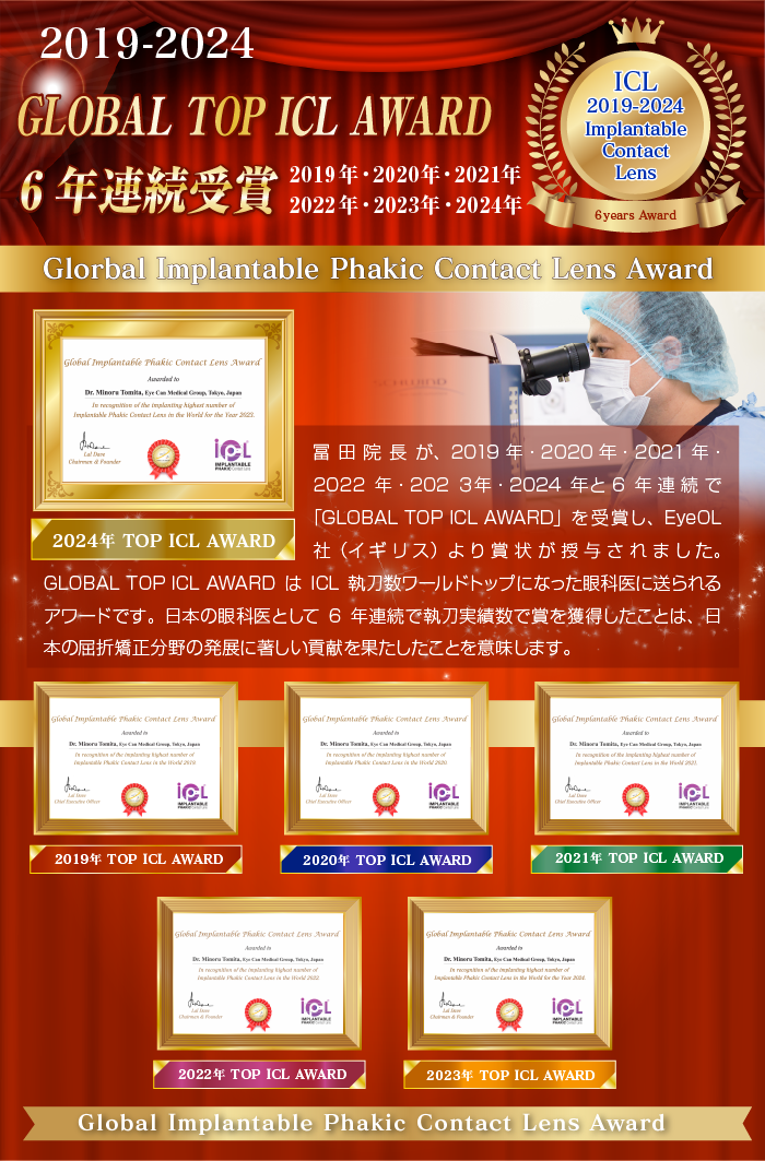 冨田院長は、2019年~2024年まで6年連続で「TOP ICL AWARD」を受賞しています。6年連続でICL手術(後房型レンズ)の症例実績世界No,1を獲得したことは、日本人眼科医として初の快挙です。これも多くの患者様から支持されてきた賜物です。